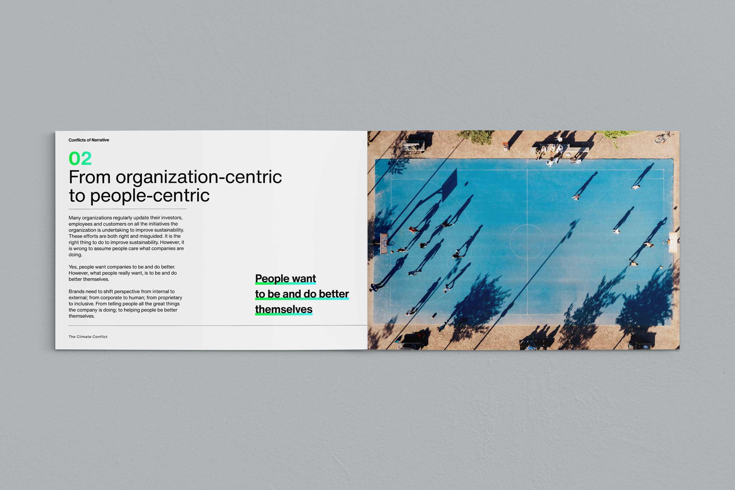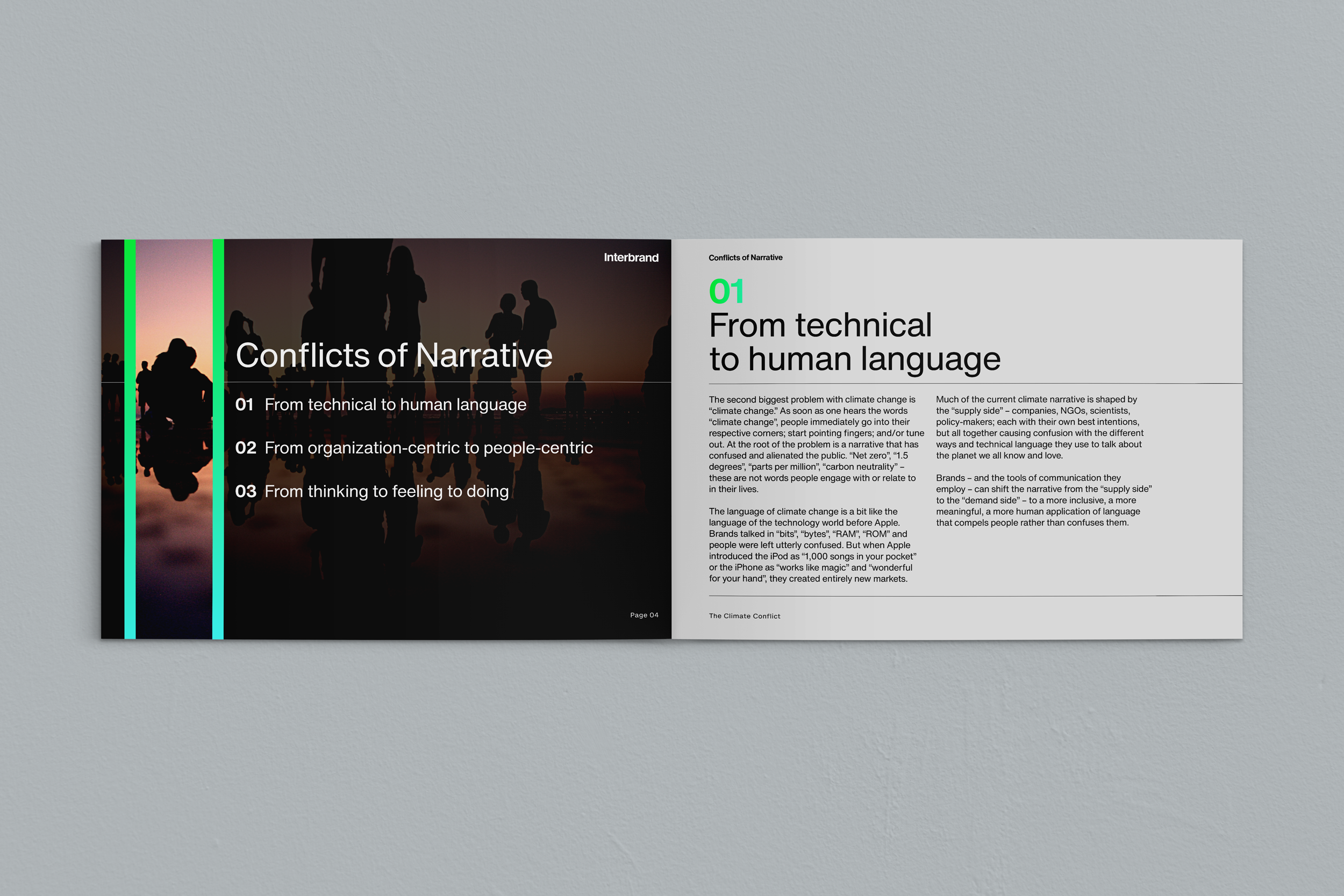 An Interbrand report approaching the climate change crisis thinking beyond the 3 core conflicts: Conflicts of Narrative; Conflicts of Action and Conflicts of Leadership. Looking at our planet earth from above, the design and imagery selection was focused on make the report easier to read on-screen. For that, I tested and implemented a variety of text styles and colour contrast with inclusivity in mind.